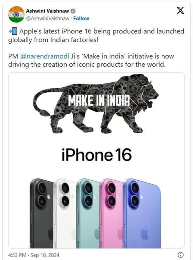 因为制造iPhone16系列全球,所以印度也很兴奋,近日印度联邦电子和信息技术部长Ashwini Vaishnaw周二表示,莫迪总理的“印度制造”已取得巨大成功,目前iPhone16全系已在印度制造了。他称iPhone16将供应全球。