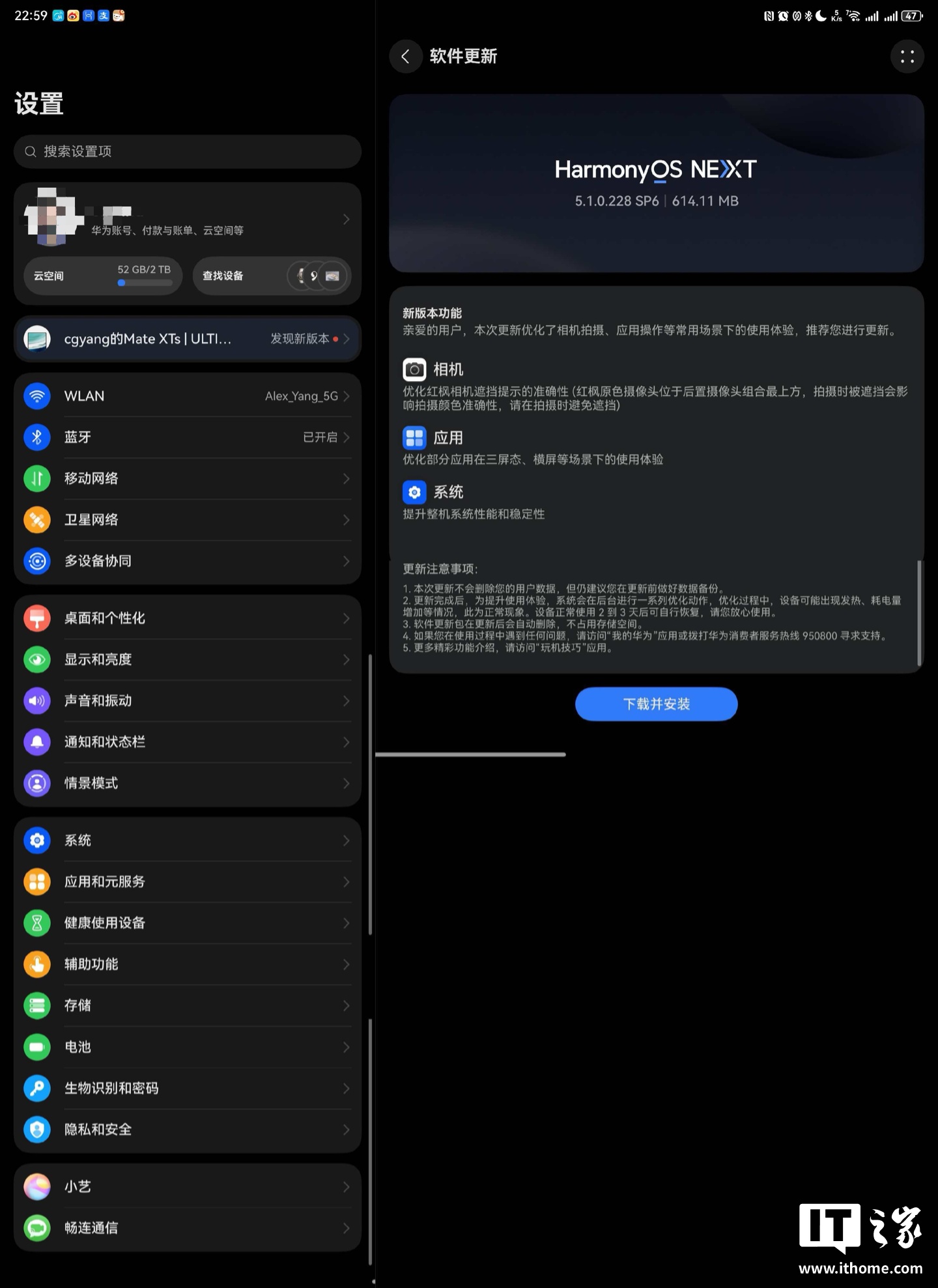 IT之家 9 月 19 日消息,据IT之家小伙伴反馈,华为 Mate XTs 非凡大师三折叠手机现已获得鸿蒙 5.1.0.228 更新,大小 614.11MB,主要提升基础功能稳定性、三屏形态应用体验等,提升用户体验。