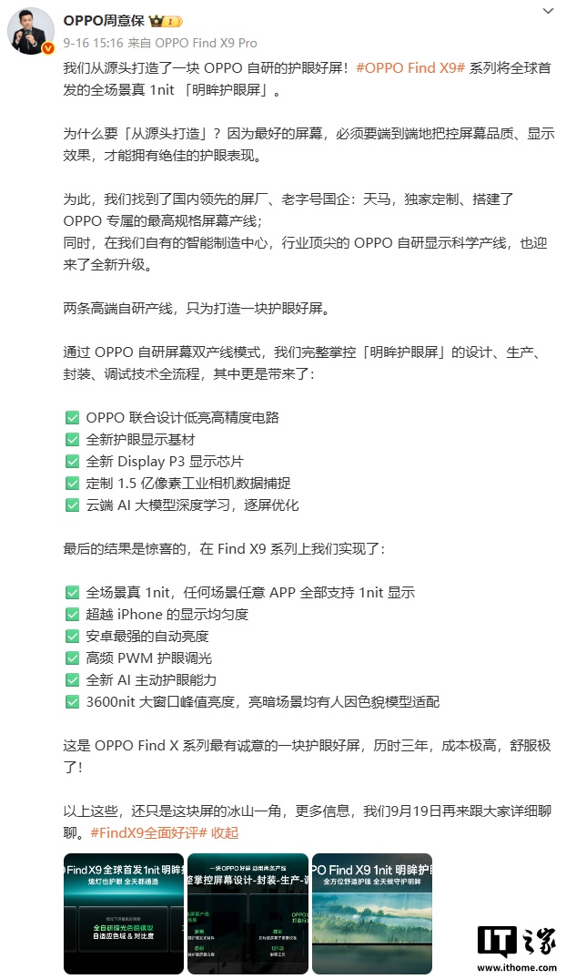 他透露,OPPO 通过自研屏幕双产线模式,完全掌握“明眸护眼屏”的设计、生产、封装、调试技术全流程,带来低亮高精度电路、全新护眼基材、新 Display P3 显示芯片等技术,在 OPPO Find X9 系列手机上实现了很多效果,IT之家附上详情如下: