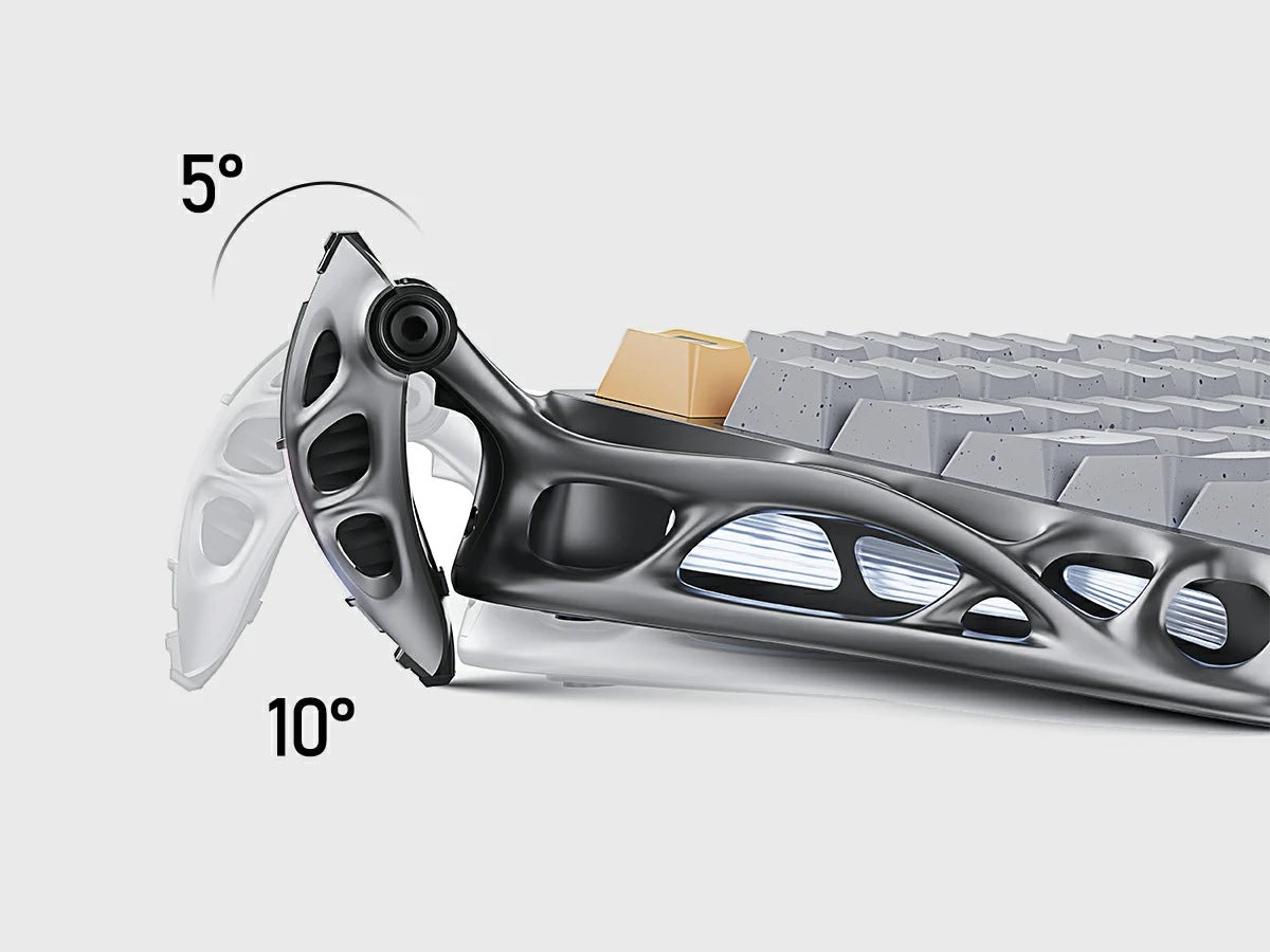 Mercury K1 Pro 键盘采用骨架式铝合金外框,尾部左右两端各有一只“脚”,可通过其内收外扩的变化调节键盘倾角,起到脚撑作用。