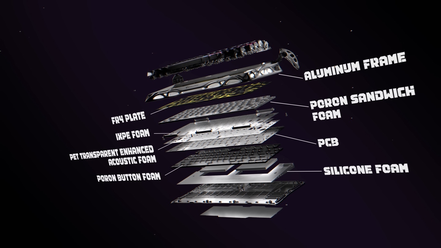 该键盘配备 FR4 定位板、PORON 夹心棉、IXPE 轴下垫、PET 透明声音优化垫,PCB 下方则是 PORON 底棉和硅胶底垫,旨在提升按键稳定性。