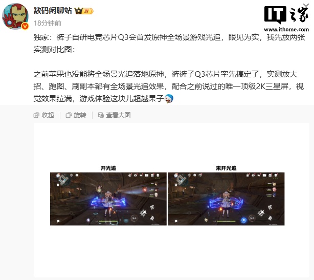 值得一提的是,博主 @数码闲聊站 今日刚刚爆料 iQOO 自研电竞芯片 Q3 会首发原神全场景游戏光追,实测放大招、跑图、刷副本都有全场景光追效果,配合唯一顶级 2K 三星屏,视觉效果拉满。