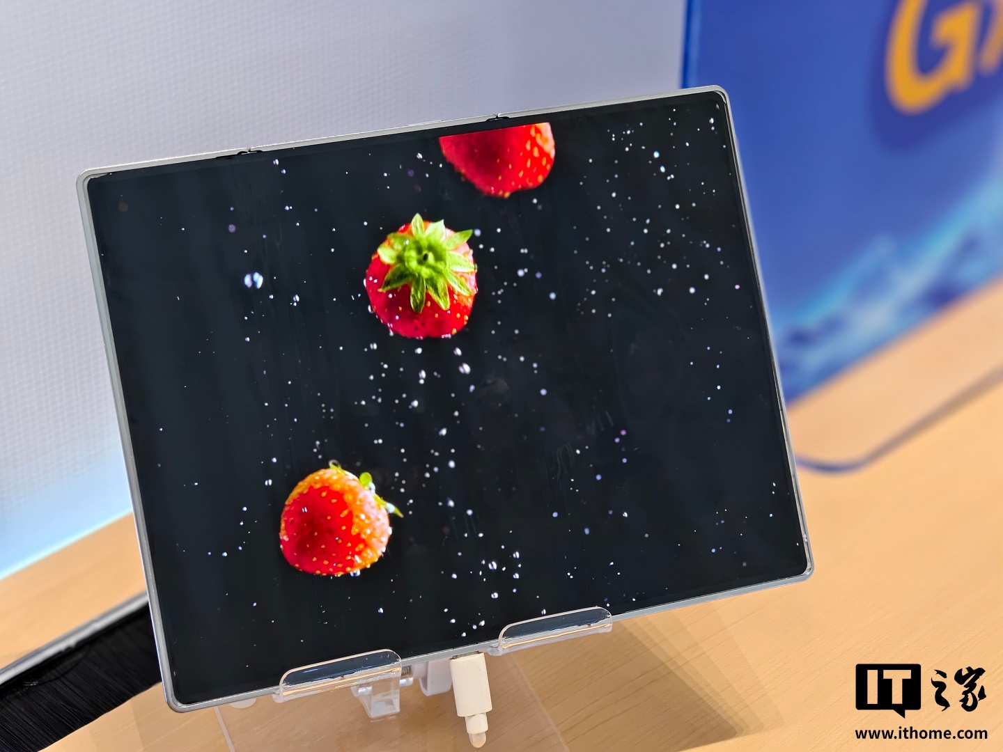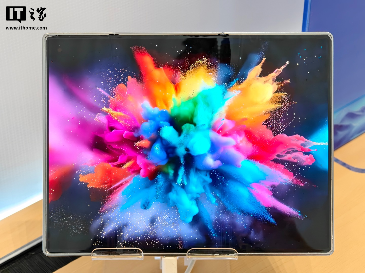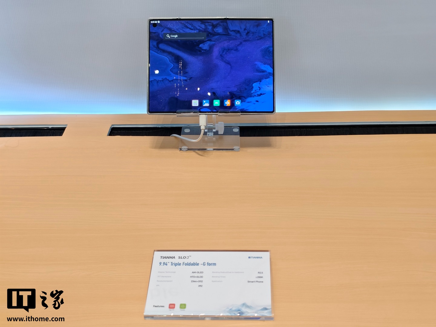 在发布会展示区,天马展出了三折叠手机屏幕方案,号称是“全球首款 G 形三折叠”,其方案与华为 Mate XT 的 Z 字形三折叠不同,采用了内向折叠的方案,整体形态较为创新。