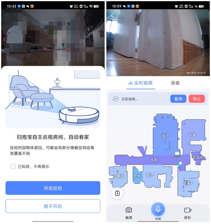 同时,你还可以开启全屋自动巡检,萤石 RS20 Pro Ultra 就会帮你把家里的每个角落都巡检一遍,看看是否有异常情况。