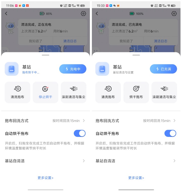 此外萤石 RS20 Pro Ultra 还支持自动烘干拖布,烘干过程中基站基本不发出声音,非常安静。在某次扫拖完成后,小编特别留意了一下,萤石 RS20 Pro Ultra 烘干一次拖布大约需要 3 个小时,因此建议大家尽量选择在夜间进行烘干。