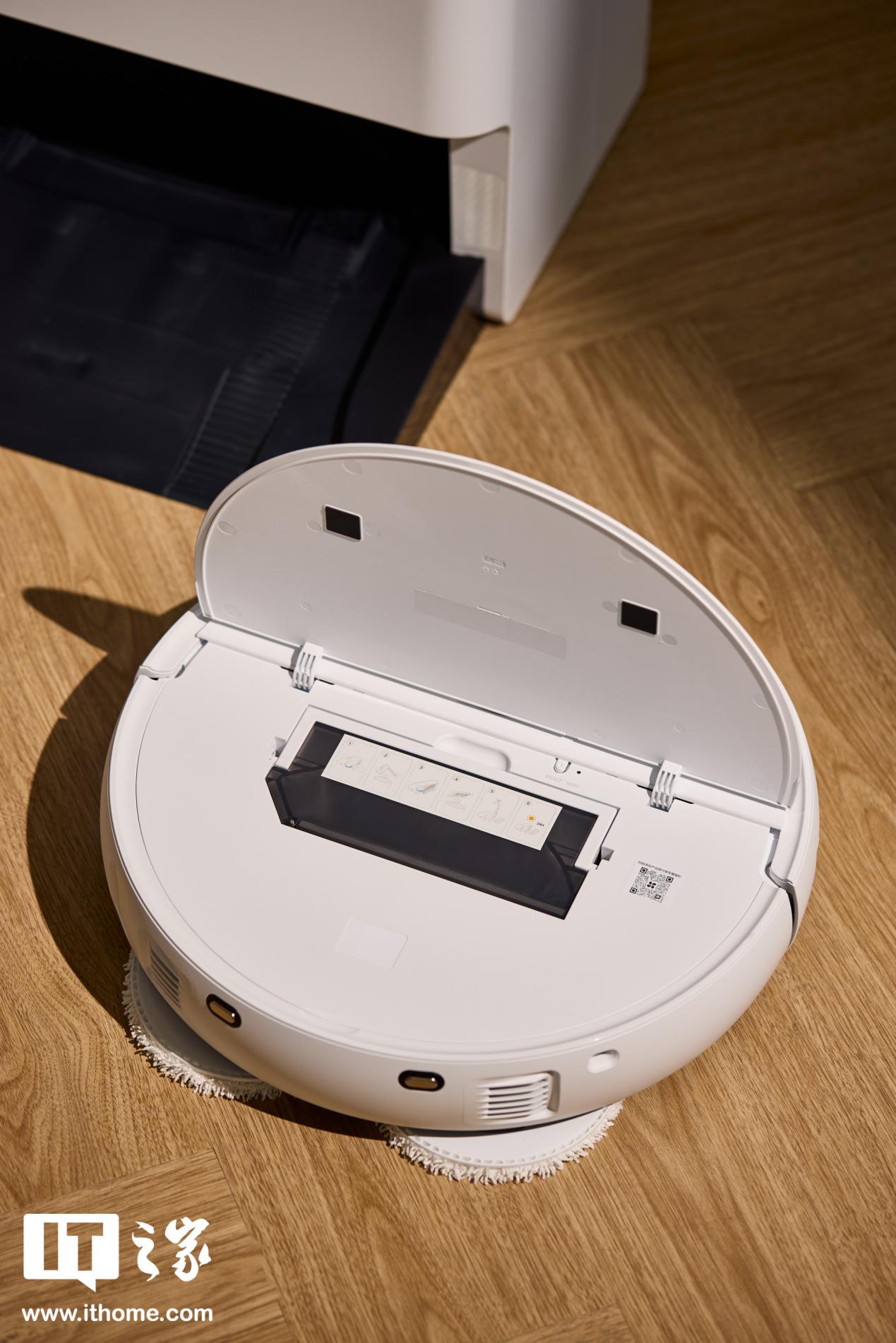 基站下方则为回充、集尘和清洁的工作区域,设有拖布装卸台、水浸传感器、过滤板、基站集尘口、清洁槽和回充轨道,尽管功能部件很丰富,但在设计上已经尽可能保证外观上的简洁、有序。