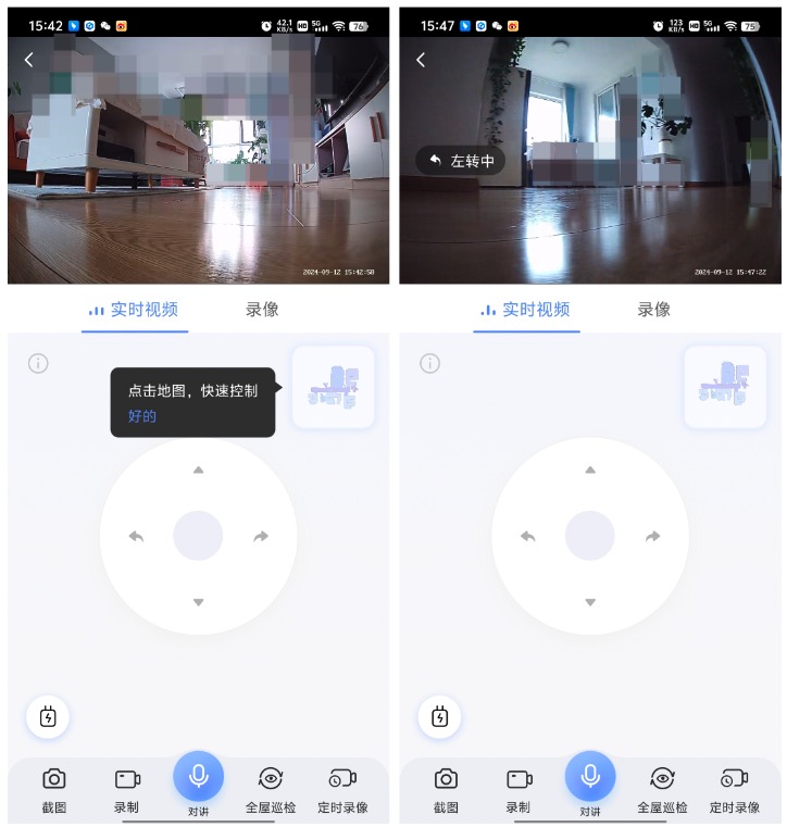 进入视频看家后,首先会看到实时视频的界面,这时你可以通过遥控按钮控制萤石 RS20 Pro Ultra,从而巡检你想要看的房间。
