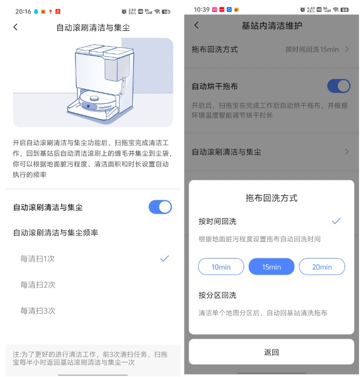 首先是拖布回洗,你可以在 App 端设置萤石 RS20 Pro Ultra 工作时拖布回洗的频率,比如每隔 10 分钟、15 分钟或 20 分钟,或者是按分区进行回洗。还有滚刷的清洁,也可以设置按照每清扫 1 次 / 2 次 / 3 次清洁一次滚刷,集尘也是如此。