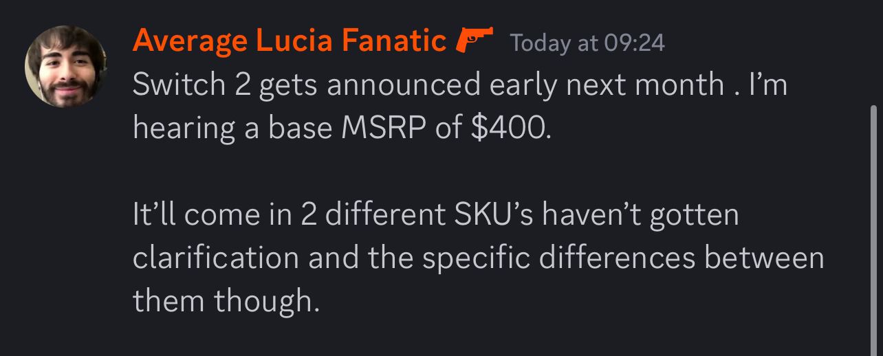 IT之家 9 月 13 日消息,消息源 moistycharlie 昨日(9 月 12 日)在 Discord 曝料,任天堂将于下月(10 月)推出 Switch 2 游戏掌机,售价为 400 美元(当前约 2848 元人民币)。
