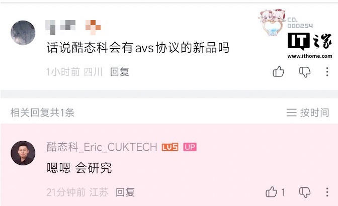 IT之家 9 月 23 日消息,酷态科 Eric 在B站评论区透露,酷态科将推出 PD 3.2 AVS 协议充电头新品,并透露现有充电头有望迎来 OTA 升级适配相应协议。