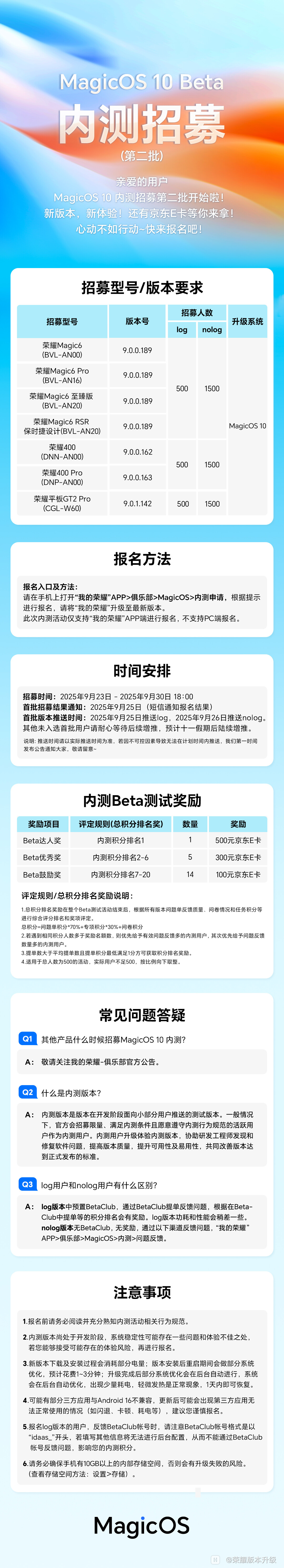 荣耀 Magic6 / Pro / 至臻版 / RSR:版本号 9.0.0.189,log 招募 500 人,nolog 招募 1500 人