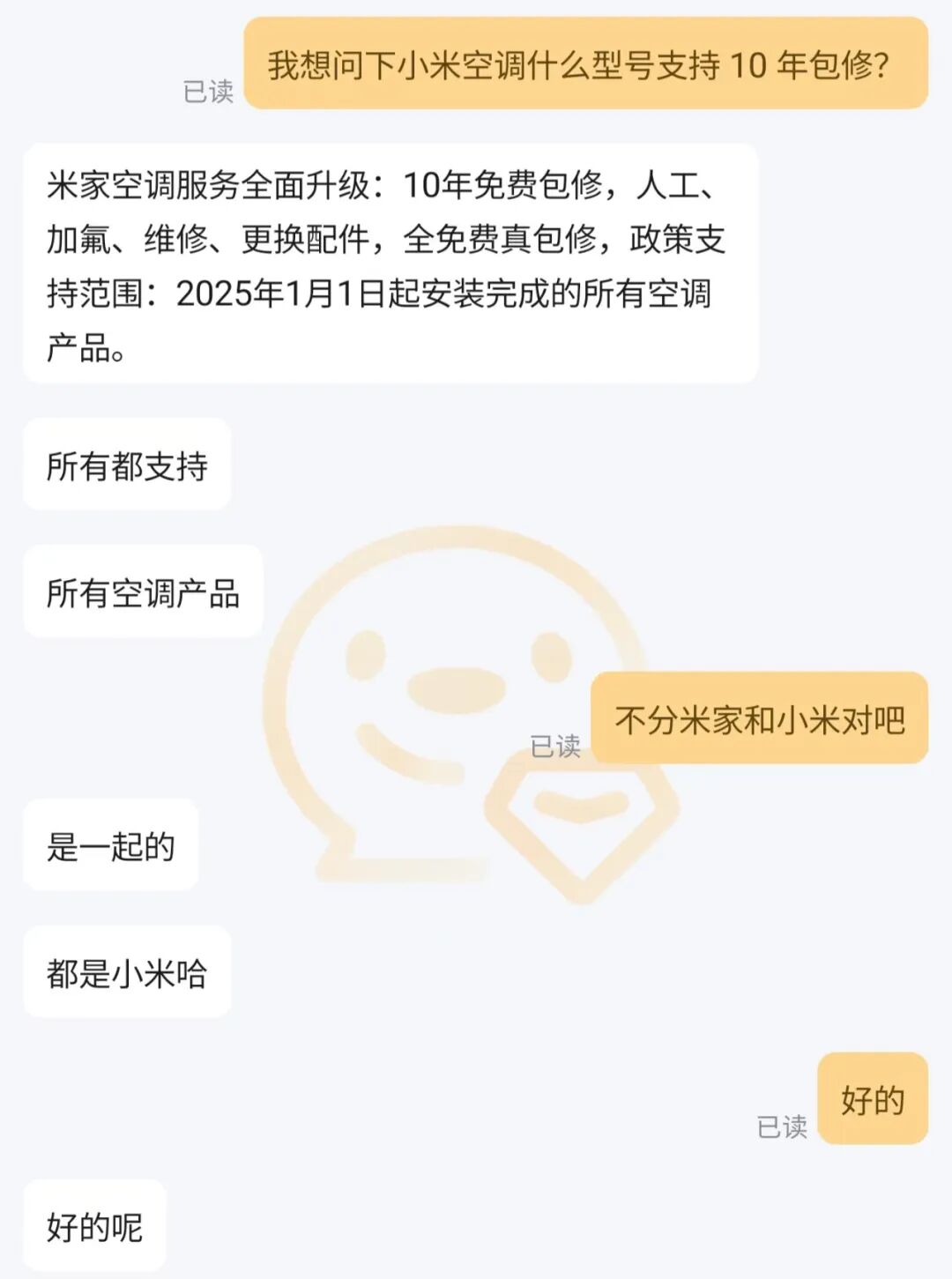 为了搞清楚这个问题,我们特意问了京东的小米客服,他们给出的回复也很干脆:“所有空调产品都支持 10 年包修。”