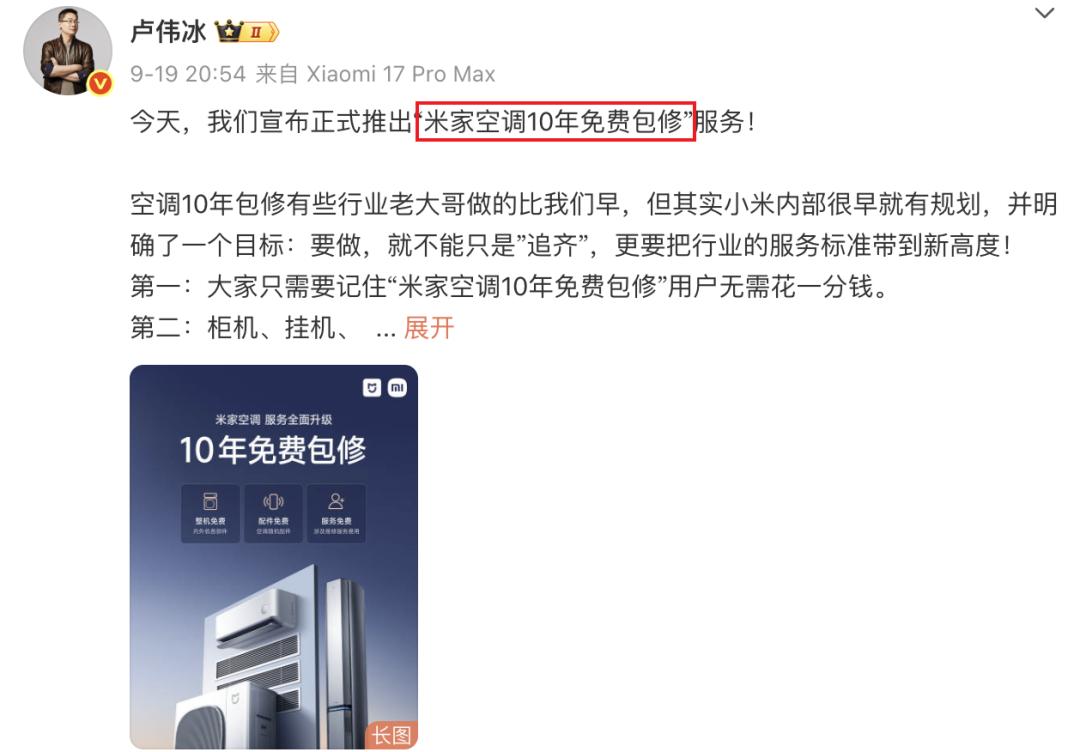 在9 月 19 日的直播中,一贯喜欢借着直播、沟通会等名义放出重磅消息的小米,果然搞了个大新闻。小米集团高级副总裁卢伟冰宣布,小米空调正式推出“10年免费包修”服务,覆盖自今年 1 月 1 日起完成首次安装的米家空调,数量大概在 750 万台。