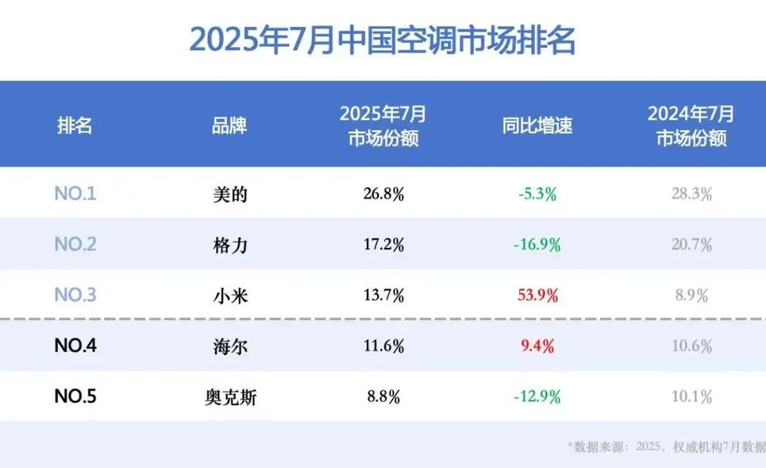 今年 7 月,小米空调同比增长53.9%,市场份额13.7%,位居行业第三。在线上市场小米的战绩更加傲人,其累计份额更是达到15.8%,与格力的16.4%仅相差0.6个百分点,两者已然成为平分秋色的对手。