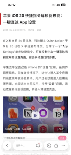 IT之家 9 月 24 日消息,科技博主 Quinn Nelson 于 9 月 20 日在 X 平台发布推文,分享了一个“App Settings”单步快捷指令,可在控制中心一键直达当前应用的设置页面,省去手动查找的步骤。