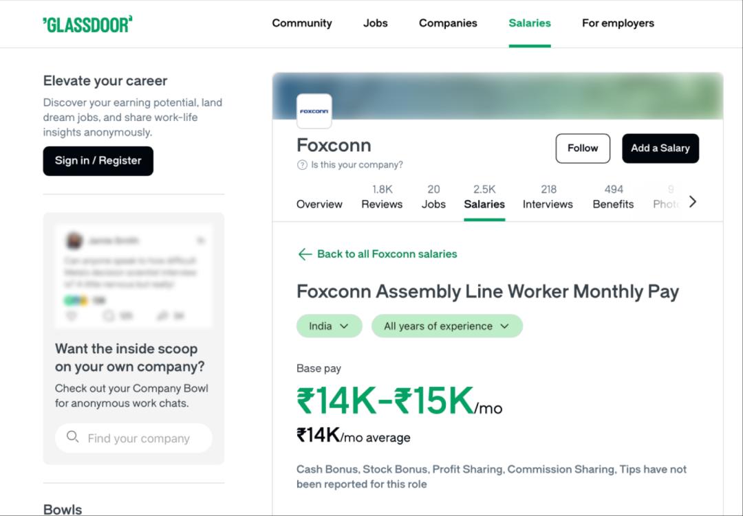 《IT时报》记者注意到,当前,苹果印度制造项目已吸纳约15万名员工,在求职网站Glassdoor上,富士康印度装配线工人的月薪仅为1.4万~1.5万卢比,折合人民币约1127元~1208元。