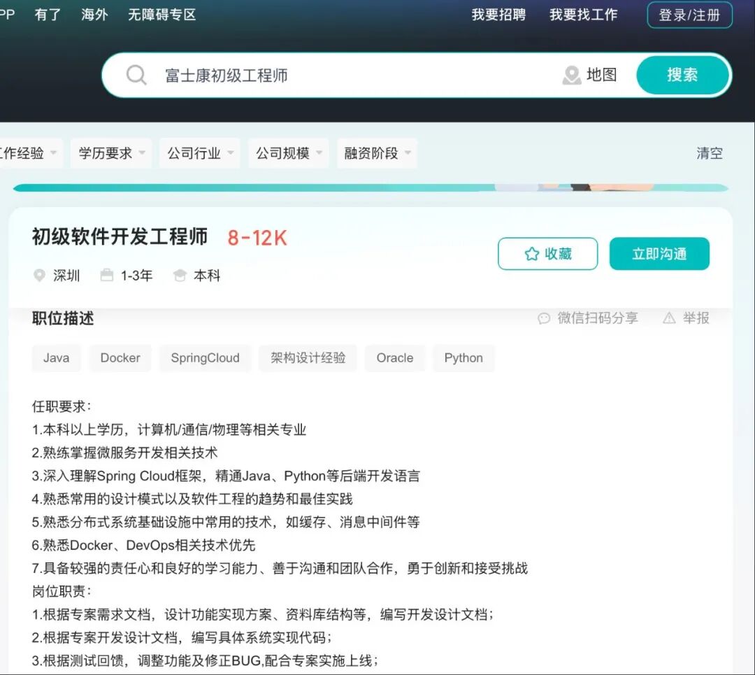 相比之下,BOSS直聘的招聘信息显示,富士康A事业群(负责iPhone组装、测试及量产的核心部门),在深圳龙华招聘初级软件开发工程师(1~3年经验),工资区间为8000元~12000元人民币。