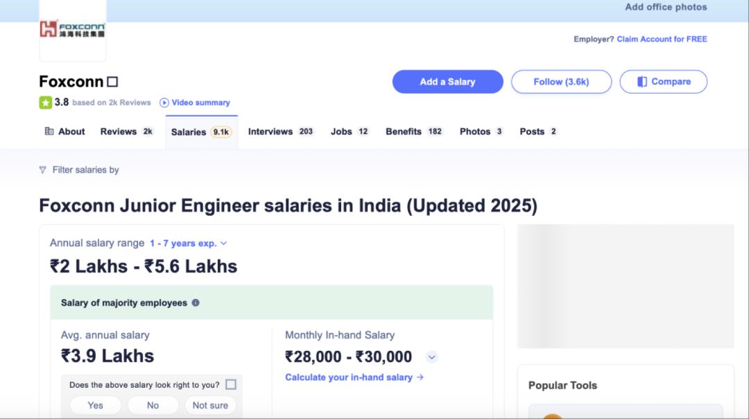 工程师的情况则稍好一些。根据印度在线求职网站ambitionbox的数据,富士康在印度的初级工程师(1~7年经验)平均月薪在2.8万~3万卢比之间(约2259~2420元人民币);而5~14年经验的高级工程师则在6万~6.2万卢比之间(约4841~5003元人民币)。