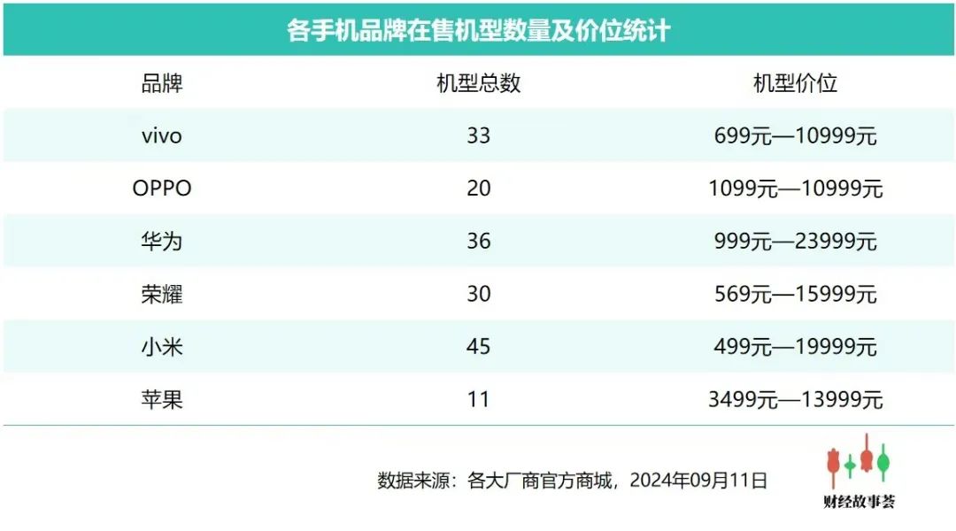 《财经故事荟》9月11日,在各手机厂商官方商城查询到:苹果在售的机型数量为11款,最低价位为3499元。而国产各大厂商们在售机型数量相对较多,且覆盖了低、中、高端各个价位段。