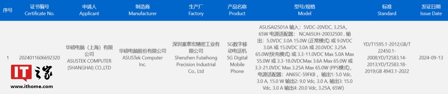 IT之家 9 月 14 日消息,一款型号为 ASUSAI2501A 的华硕新机于昨日(9 月 13 日)通过了 3C 认证,支持 65W 快充。据博主 @完美编排数码 透露,该机为 ROG 9。