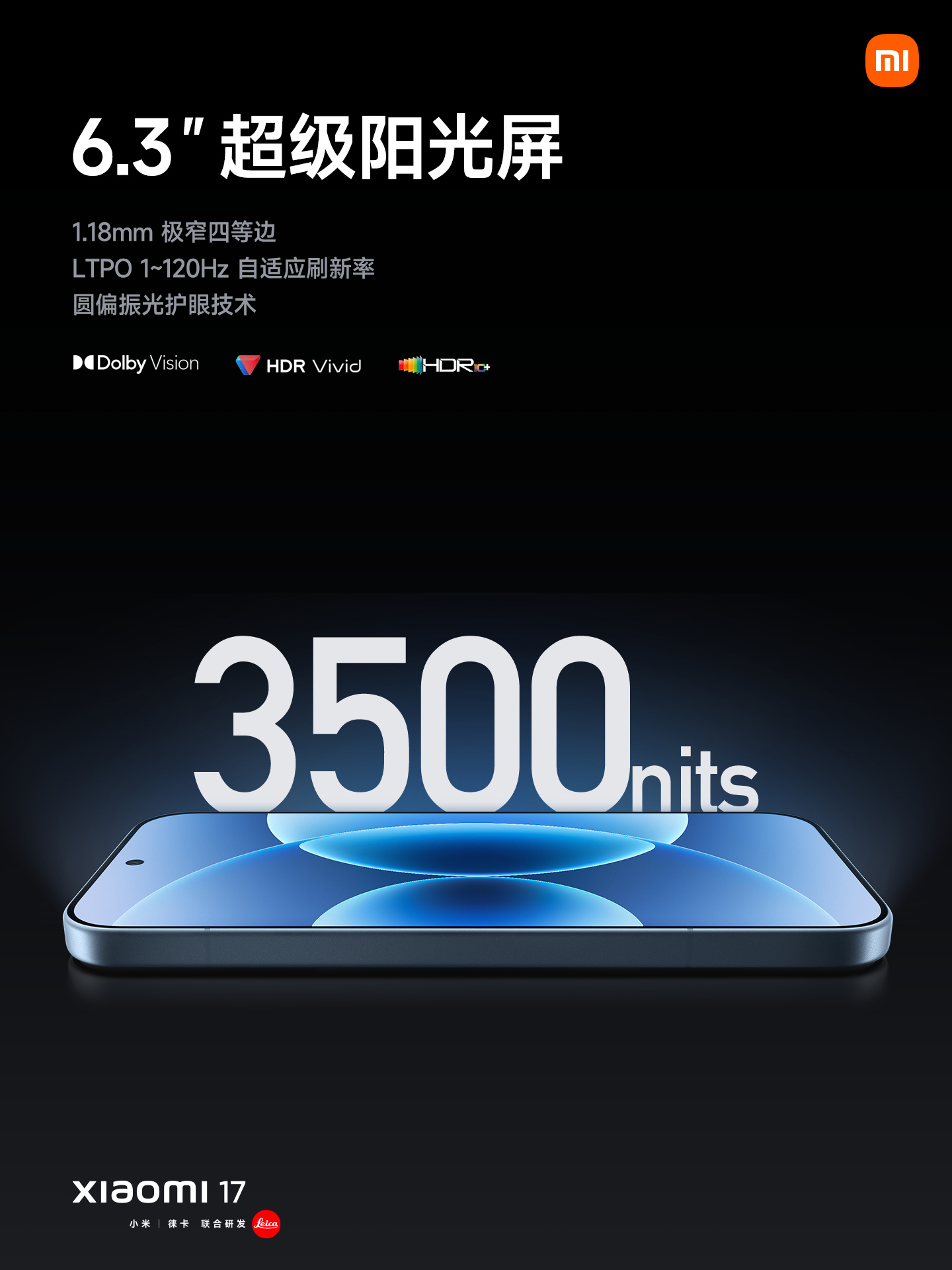 小米 17 的屏幕支持 3500 尼特峰值亮度,采用新一代 M10 屏幕发光技术体系,新型红色发光主材的发光效率提升 11.4%,国产发光材料的发光效率首次实现国际领先。