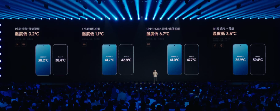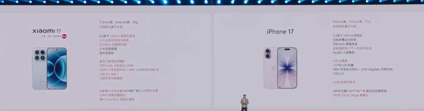小米 17 手机全球首发高通第五代骁龙 8 至尊版处理器,配有立体环形冷泵散热系统(3 倍传统 VC 性能),宣称相比 iPhone 17 在散热能力方面更强。