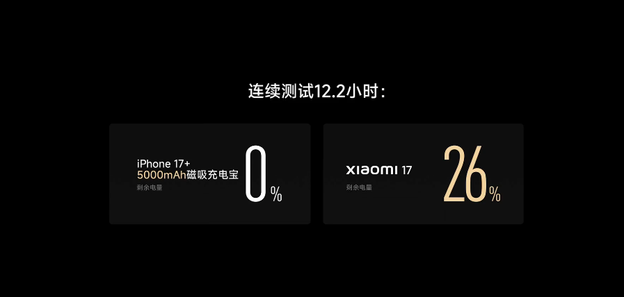 小米 17 还配备了一块 7000mAh 电池,官方实测连续刷 12.2 小时短视频,比 iPhone 17 + 5000mAh 磁吸充电宝的续航还要长。