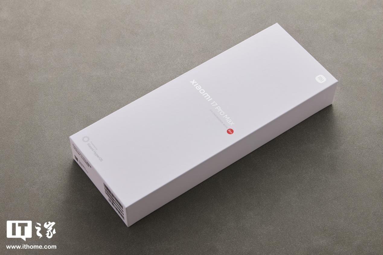 由于小米 17 Pro 系列的双 Pro 机型在外观设计语言上差别不大,所以这里我们先主要以小米 17 Pro 为主进行介绍。IT之家拿到的这款为黑色款,不过包装还是白色的,长方体设计,不过相比普通的手机盒拉长了一些,表面是烫印的银色“xiaomi 17 Pro”Logo,红色徕卡标识很醒目。