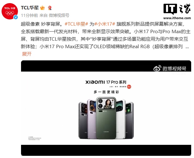 IT之家 9 月 26 日消息,TCL 华星今日发文确认为小米 17 旗舰系列新品提供屏幕解决方案,全系搭载最新一代发光材料。