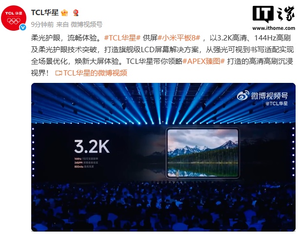 此外,TCL 华星还为小米平板 8 供屏,官方宣称以 3.2K 高清、144Hz 高刷及柔光护眼技术突破,打造旗舰级 LCD 屏幕解决方案,从强光可视到书写适配实现全场景优化。