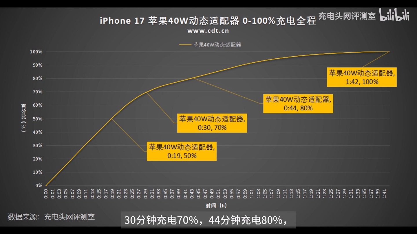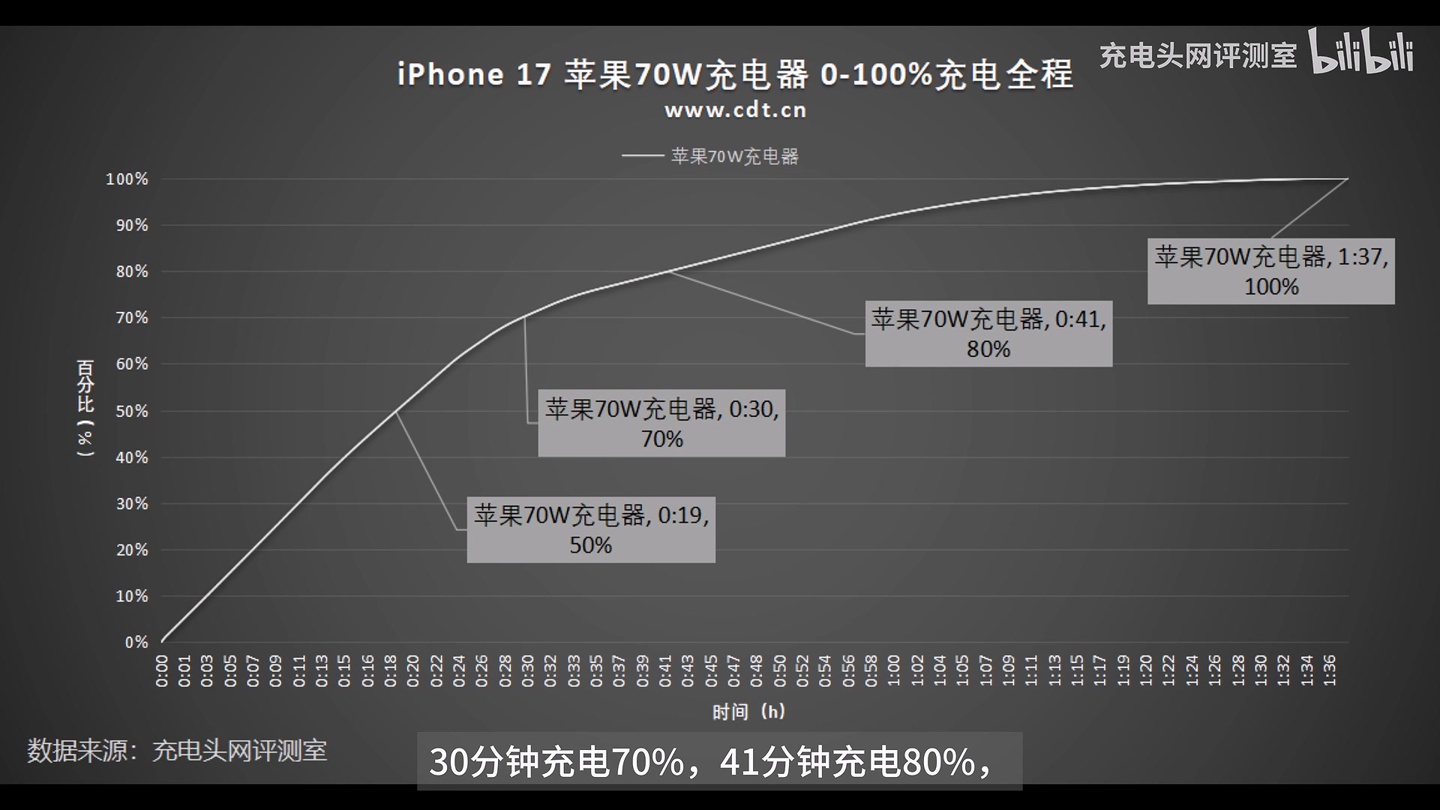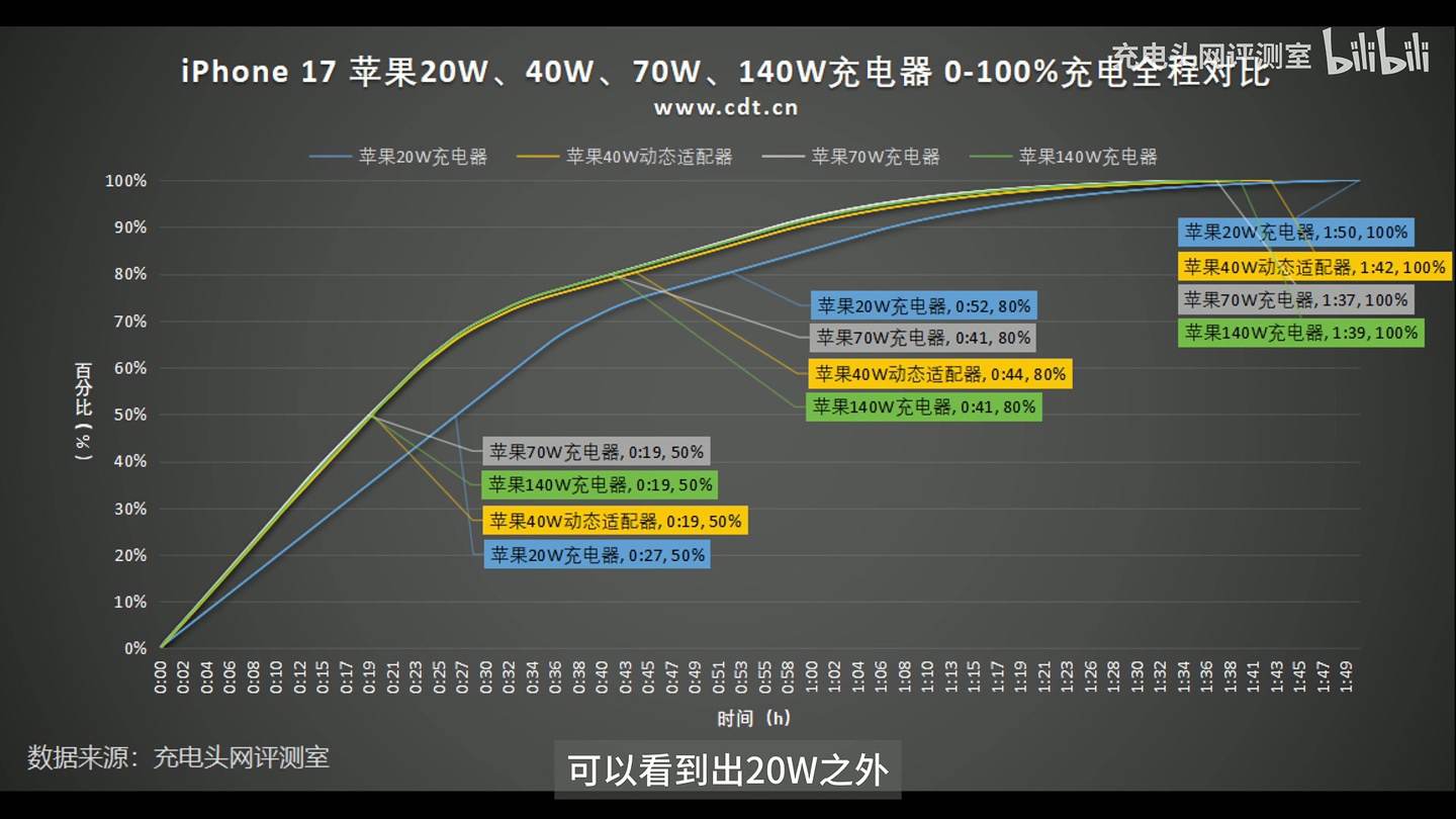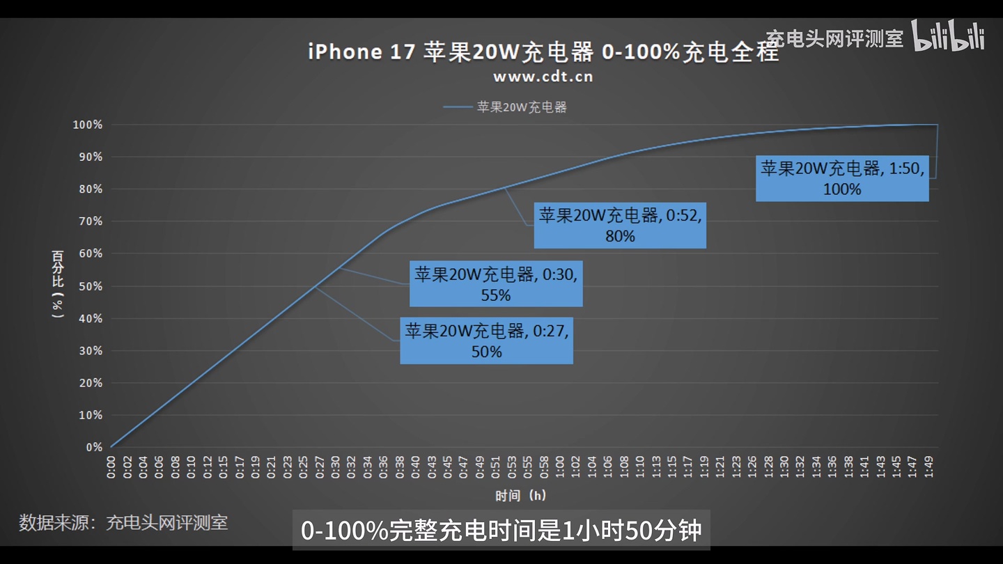 IT之家 9 月 27 日消息,科技媒体 ChargerLAB 昨日(9 月 26 日)发布博文,使用了从 18W 到 140W 的多款苹果官方 USB-C 充电器测试,报告了苹果 iPhone 17 标准版的有线充电情况,发现该设备的峰值充电速度达到约 27W 至 28W。