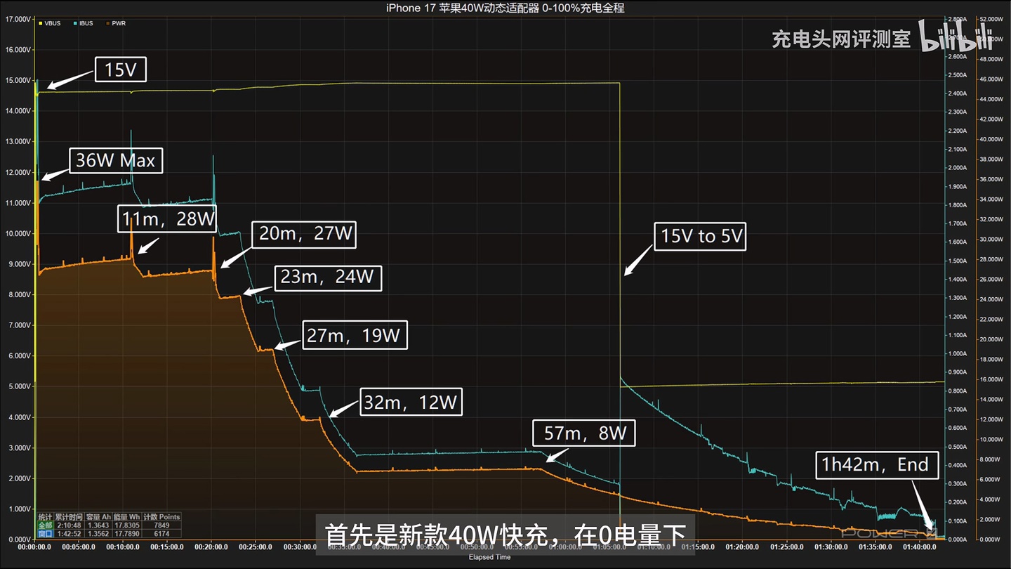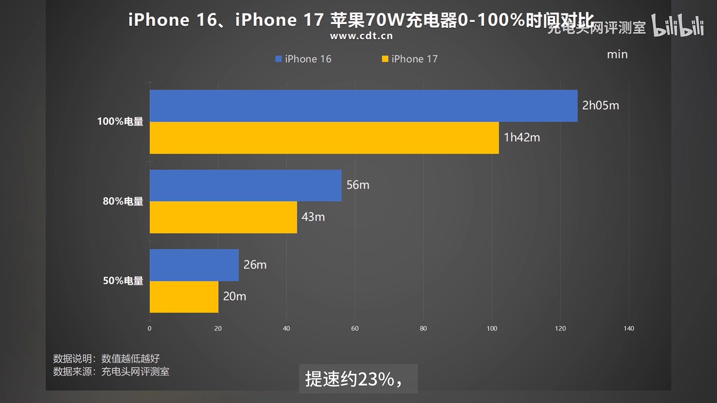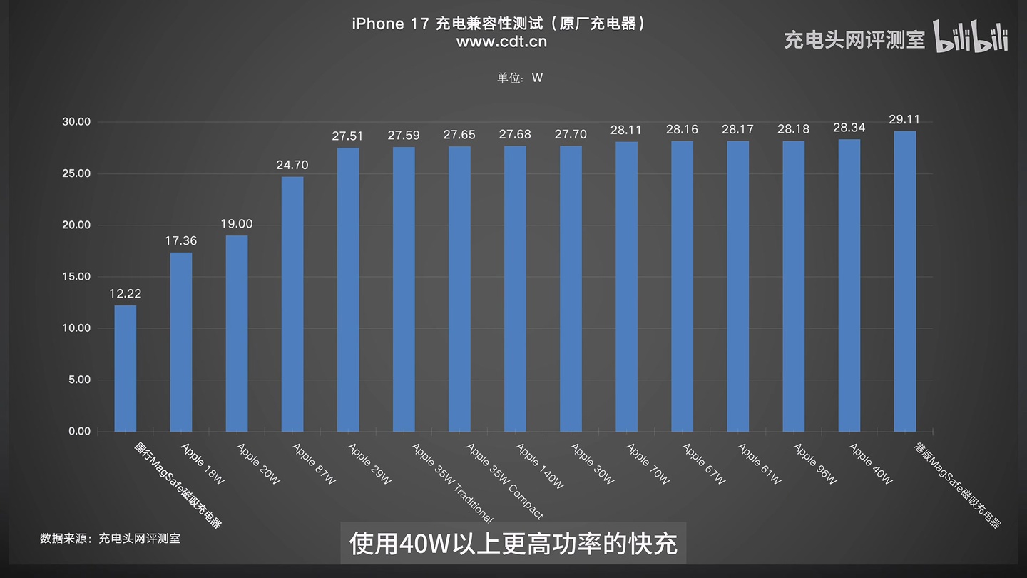 根据 ChargerLAB 的测试数据,苹果标准版 iPhone 16 的峰值充电速度在 23W 左右,而标准版 iPhone 17 在连接 29W 及以上功率的充电器时,其峰值充电功率能够稳定在 27W 至 28W 之间。