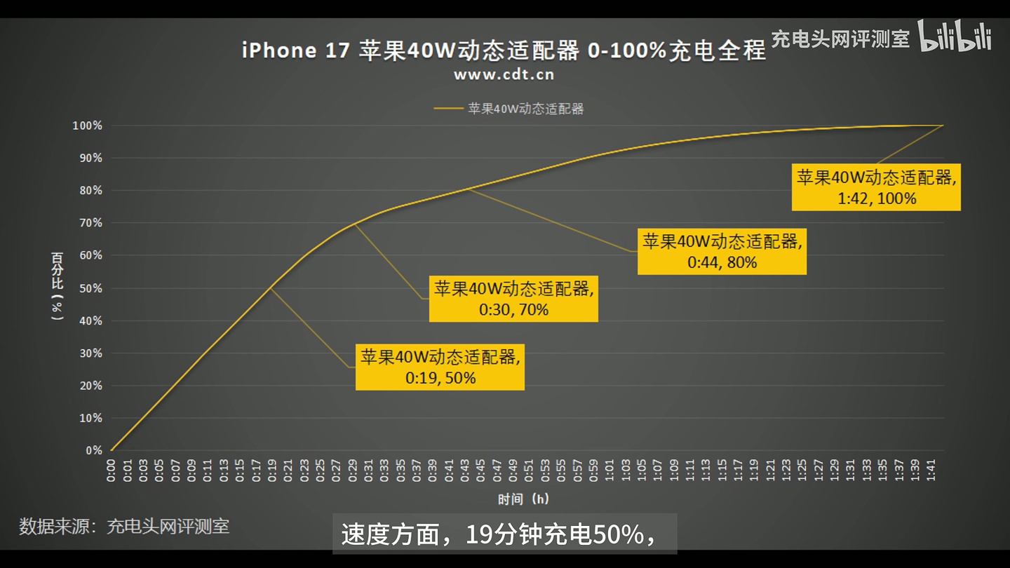 此次发布的 iPhone 17 标准版,以国行机型为例,原厂 40W 快充 19 分钟充至 50%,兼容第三方充电器、充电宝等快充。40W 功率含 PD 协议即可达到理想快充状态。