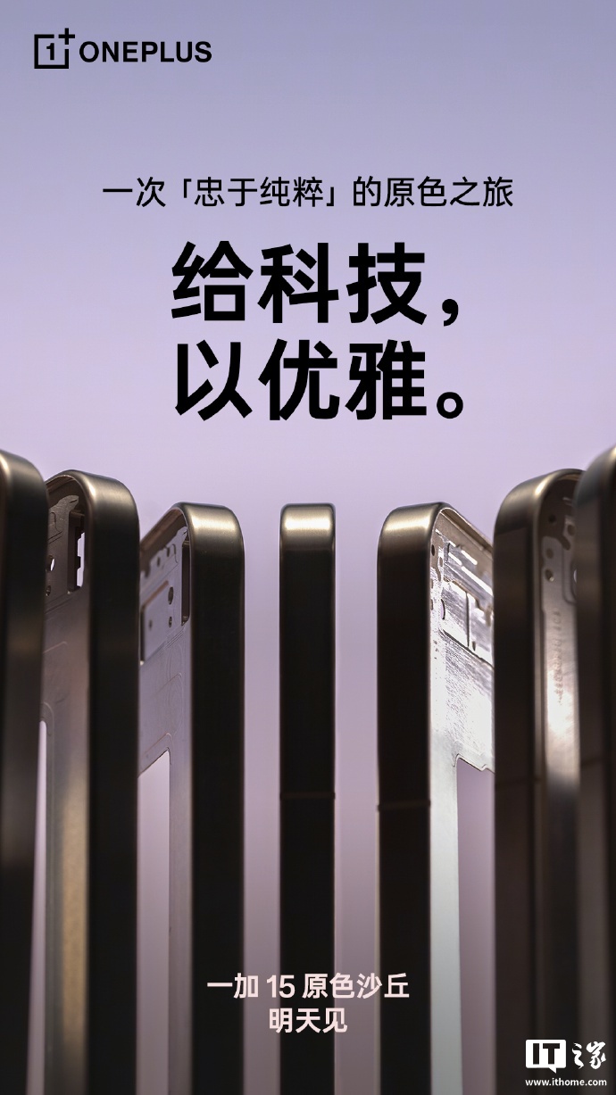IT之家 9 月 27 日消息,一加手机刚刚宣布,一加 15“原色沙丘”明天见,官方宣称其采用一种“牛上天”的科技工艺,一场“比钛强”的工艺焕新,一次“忠于纯粹”的原色之旅。