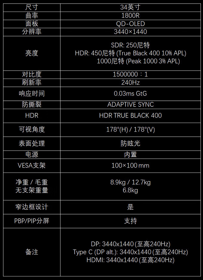 据介绍,这款显示器配备 3440 x 1440 分辨率 240Hz QD-OLED 面板(支持 HDMI / DP / USB-C 240Hz),曲率 1800R,亮度 1000 尼特,动态对比度 150 万:1,响应速度 0.03ms,支持 10-Bit 色彩,覆盖 99% DCI-P3 色域、97% Adobe RGB 色域。