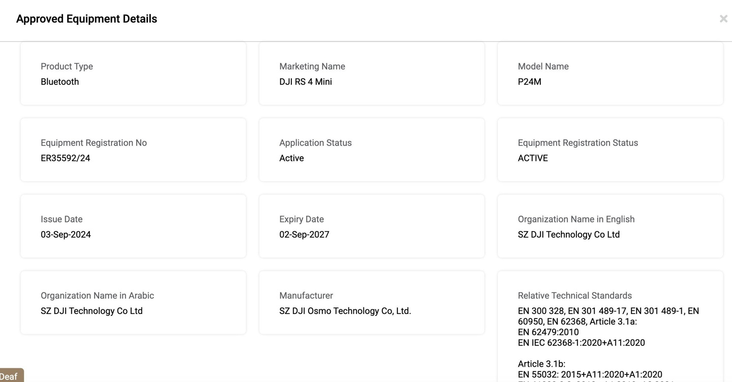 IT之家查询公开资料,还发现大疆 RS4 Mini 已经通过了 TDRA 认证。