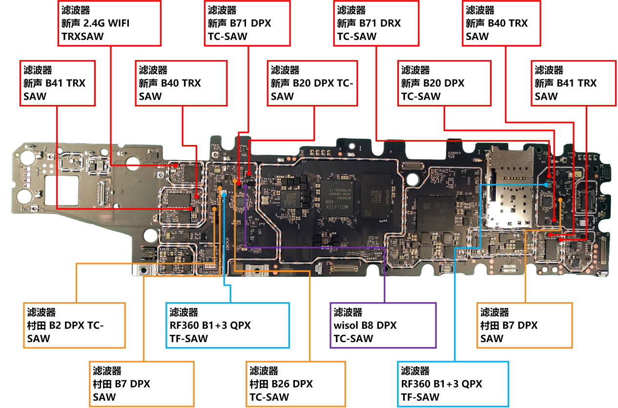 上图是联想小新PAD 11拆机后的主板,通过对元器件的逐一分析发现,国产物料与进口产品交织分布,并展现出高度国产化的特征,尤其是过去国产占比极低的滤波器表现亮眼。其中,滤波器又以新声半导体的产品数量最为突出,在联想小新PAD 11中新声一共贡献了6颗滤波器,其中2颗BAW为该平板的独家供应,3颗TC-SAW与国际巨头村田平分秋色。