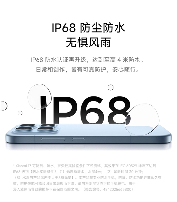 其他方面,小米17系列还搭载USB 3.2 Gen1,立体环形冷泵散热并支持IP68级防水。