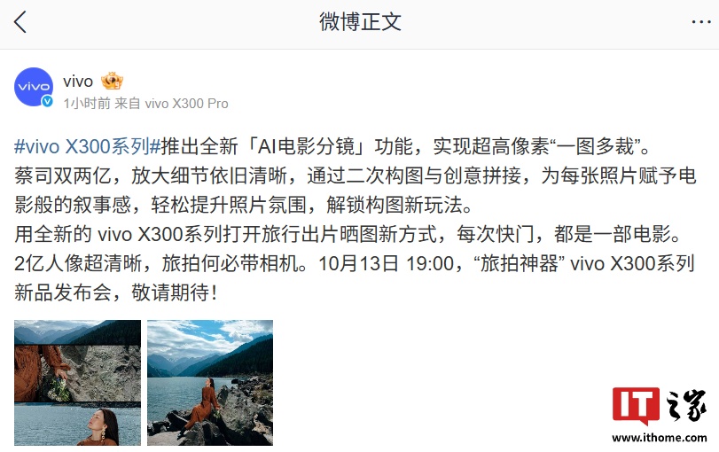 IT之家 9 月 28 日消息,vivo 官方今日宣布,vivo X300 系列手机推出全新「AI 电影分镜」功能,可实现超高像素“一图多裁”。
