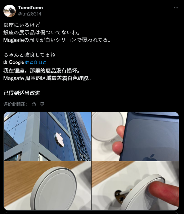 苹果门店使用的 MagSafe 支架,与该公司在售的 MagSafe 充电器设计相似,支架周边均带有金属环。当用户从支架上取下手机时,很容易触碰到这一金属环;且随着使用时间推移,金属环似乎会逐渐出现磨损和缺口。
