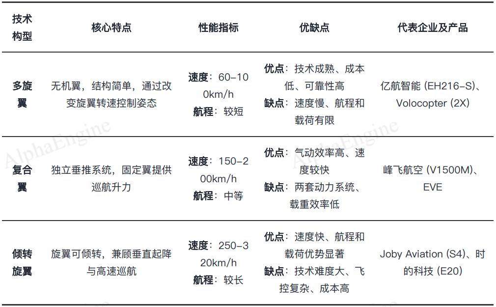 从技术代际看,多旋翼属第一代,复合翼(升力巡航)属第二代,倾转旋翼属第三代,航效和研发难度依次提高。