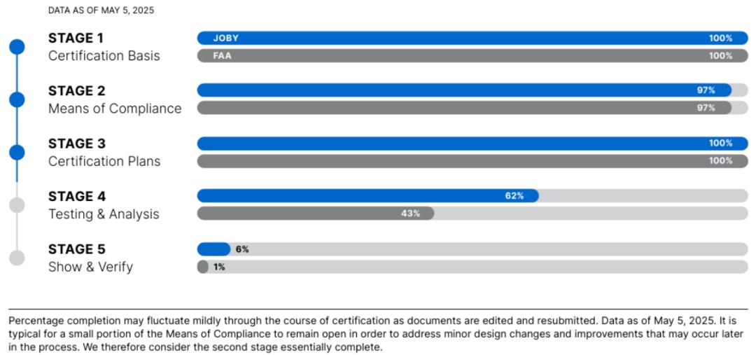截至 2025 年Q2, Joby 在 FAA 型号认证的第四阶段(共五个阶段)已完成 70% ,行业领先地位稳固。