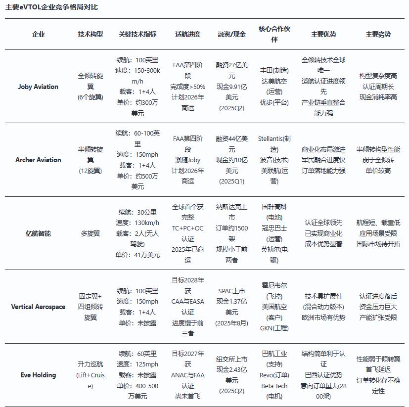 目前,eVTOL头部企业的竞争已超越单一技术维度,转向“商业化、监管认证、资本整合”多方面的综合较量。
