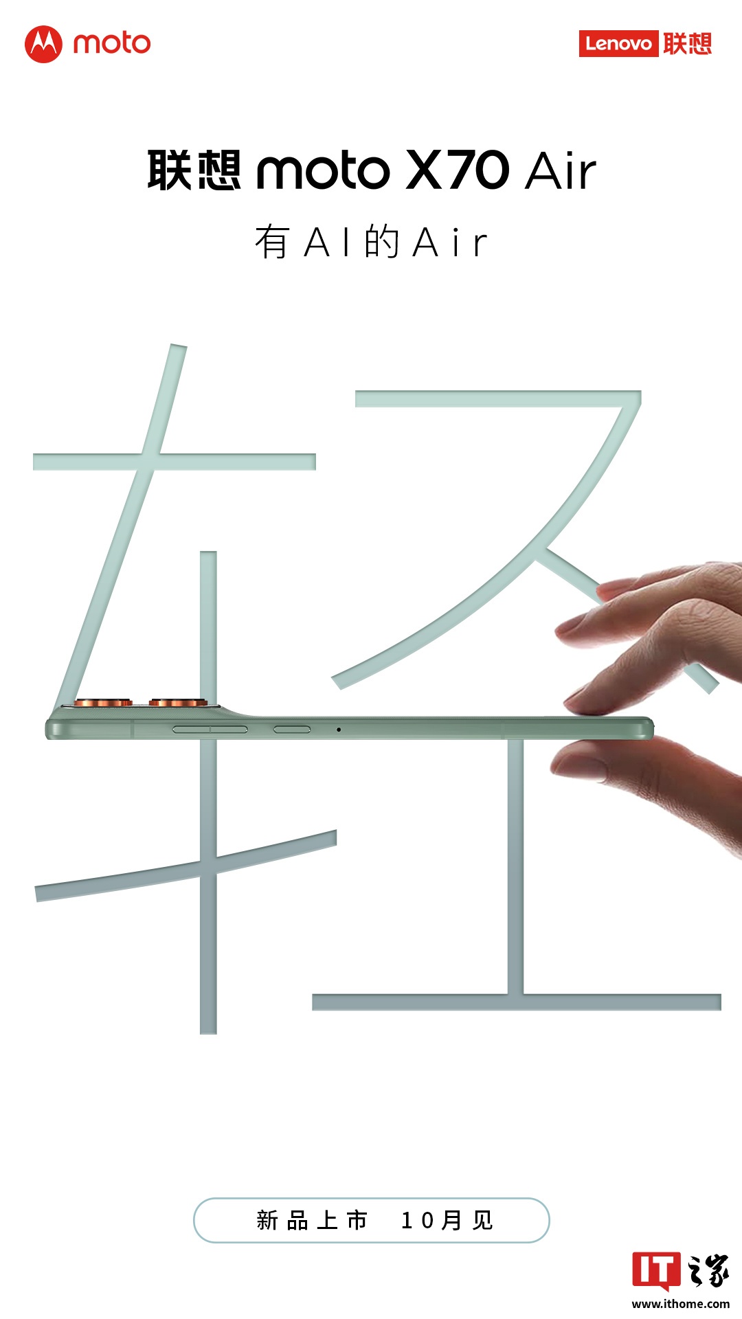 IT之家 9 月 29 日消息,联想 moto 官方今日官宣了一款新机 —— moto X70 Air。该机将于 10 月底上市,号称“有 AI 的 Air”。