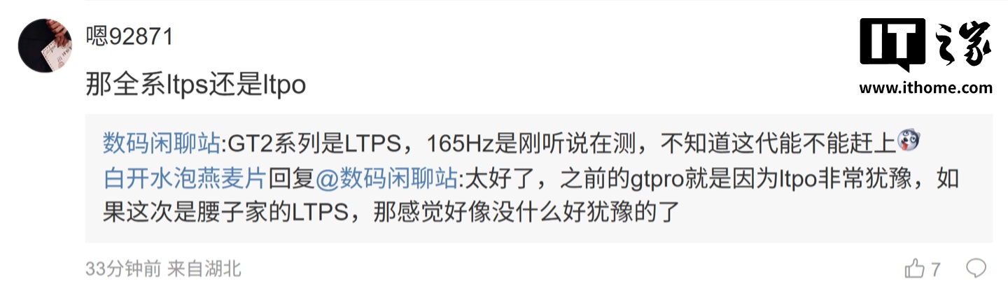 ”;另一名用户则询问道:“那全系 LTPS 还是 LTPO”,博主则回复道:“GT2 系列是 LTPS,165Hz 是刚听说在测,不知道这代能不能赶上