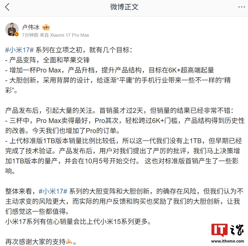 IT之家 9 月 29 日消息,小米集团合伙人、总裁,手机部总裁,小米品牌总经理卢伟冰今日发文透露了小米 17 系列立项之初的几个目标,包括: