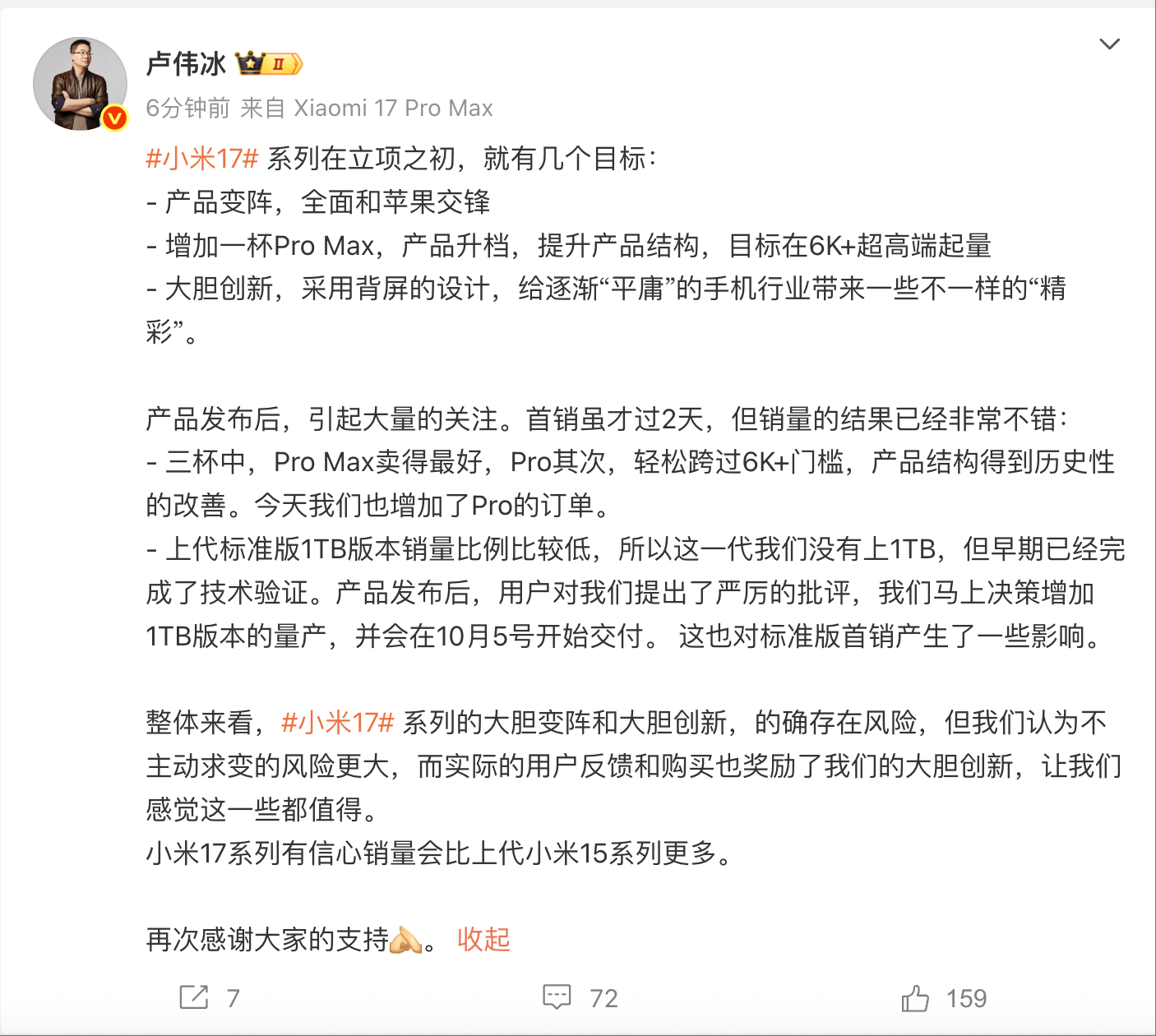 凤凰网科技讯 9月29日,小米集团合伙人卢伟冰发文称,小米17系列中,Pro Max卖得最好,Pro其次,轻松跨过6K+门槛,产品结构得到历史性的改善。今天也增加了Pro的订单。