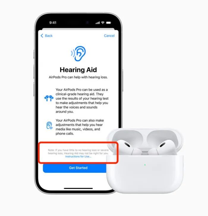 然而,这个助听器还是有一定的限制,尤其是对于重度听力损失患者,依然需要借助专业医疗设备的力量。这一点苹果也还是“心有余而力不足”,在蝇头小字处表示「如果您有太严重的听力损伤,听力帮助可能不适用于您」。