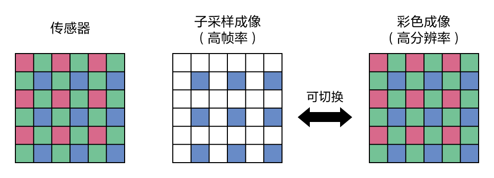 帧率 (全像素输出) | 8bit: 112 frame/s 10bit: 102 frame/s 12bit: 73 frame/s | 8bit: 138 frame/s 10bit: 126 frame/s 12bit: 90 frame/s | 8bit: 225 frame/s 10bit: 201 frame/s 12bit: 136 frame/s |