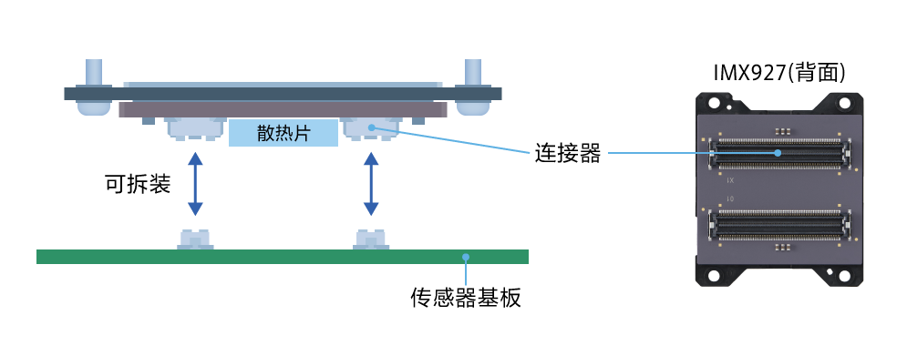 IMX927 系列全系列采用了新开发的带连接器的陶瓷封装。全系列的共 16 款产品采用通用连接器,具备引脚兼容(pin-compatible)。封装背面预留了散热片安装空间,可实现高效散热设计。